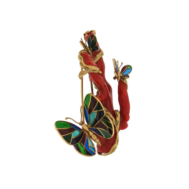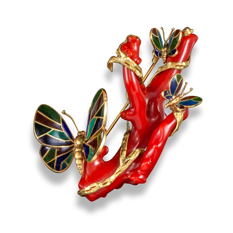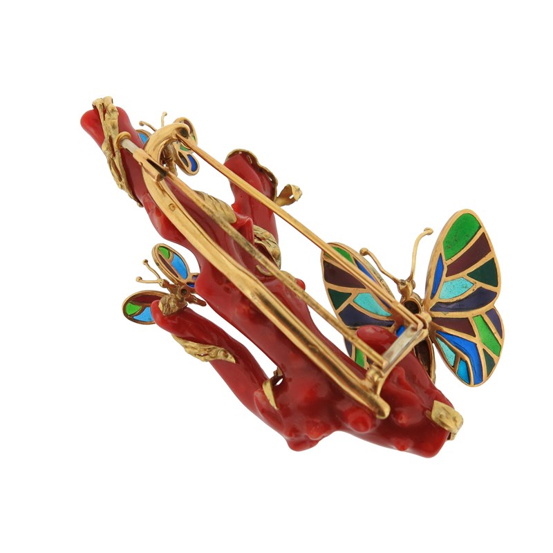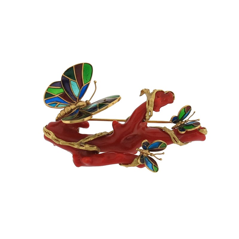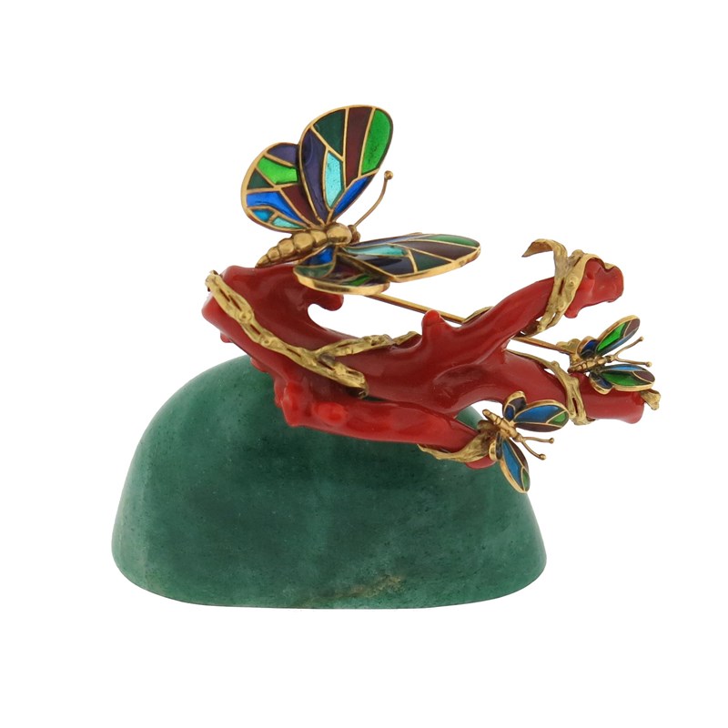 A French coral and enamel gold brooch, the branch of red coral is entwined with a textured gold vine set with plique-a-jour enamel gold butterlies, with French control marks and maker's mark AG in lozenge, 8cm wide, together with a polished aventurine quartz display base