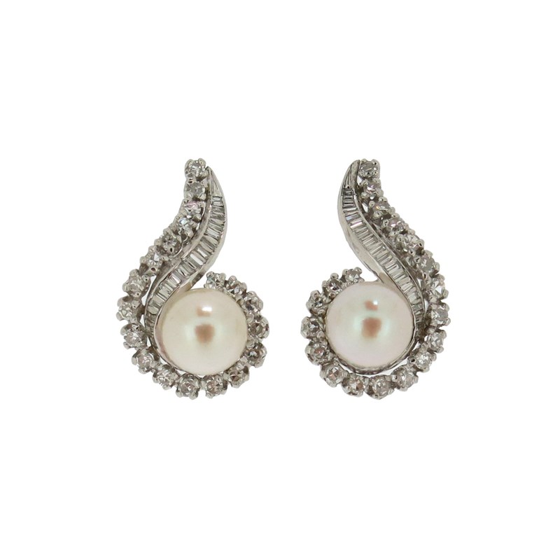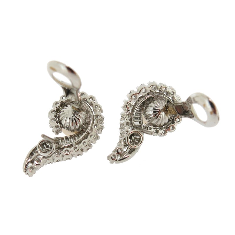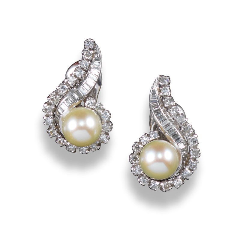 A pair of cultured pearl and diamond earrings, the cultured pearls set within a scroll surround of single-cut and baguette-shaped diamonds in white gold, post and clip fittings, 3cm high