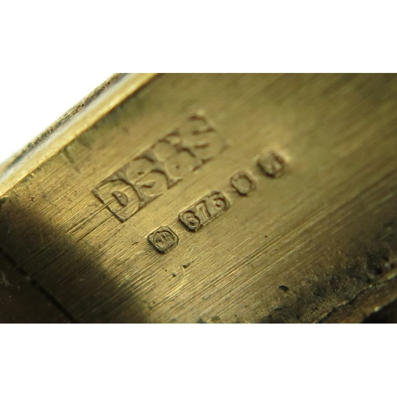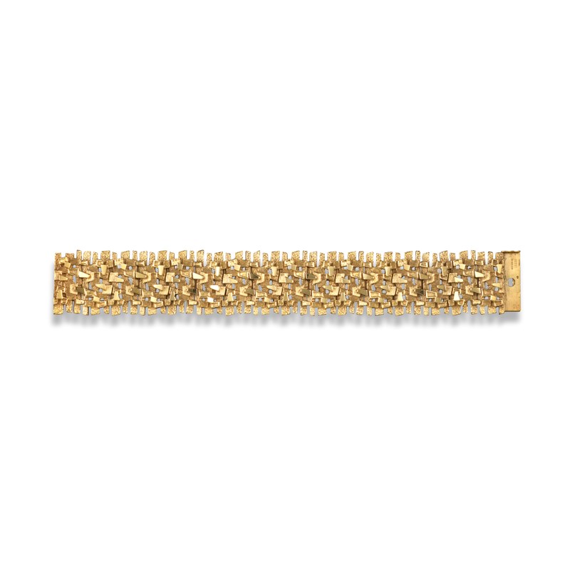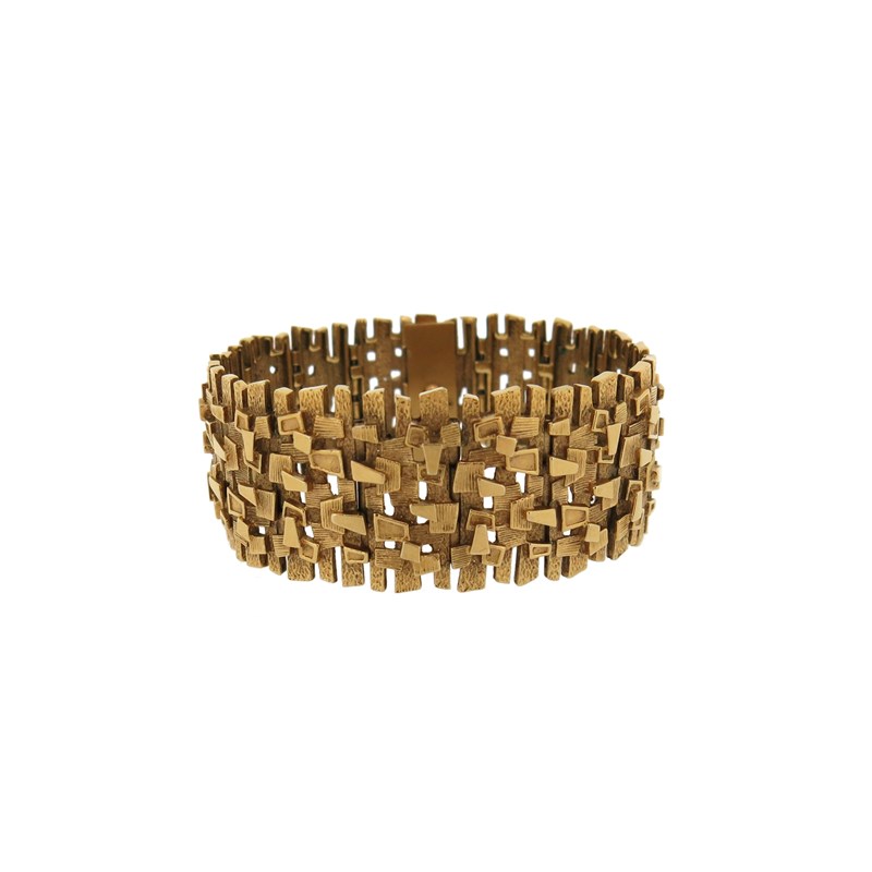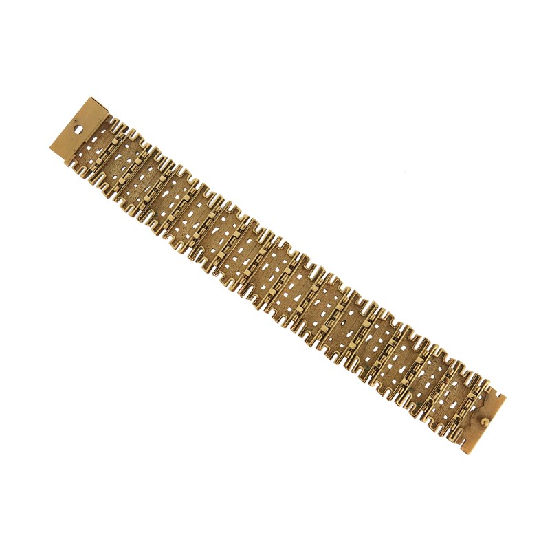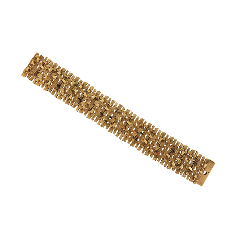 An abstract gold bracelet, with textured and plain decoration, London hallmarks for 9ct gold, 1975, maker DS&S, 17.5cm long, 57g