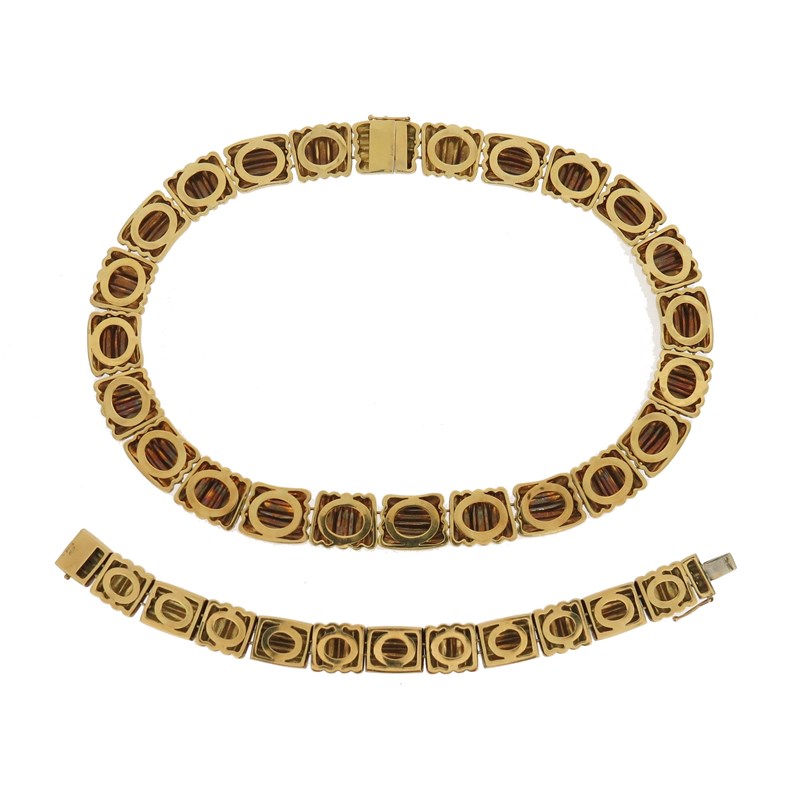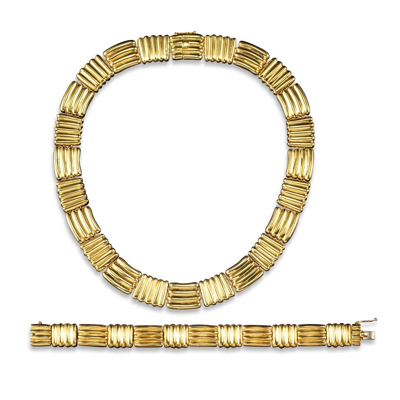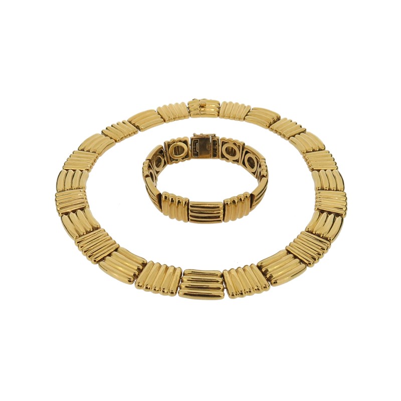 A gold suite of jewellery, the collar necklace and bracelet with fluted rectangular links, necklace 43cm, bracelet 18cm, 150g total