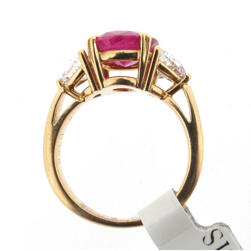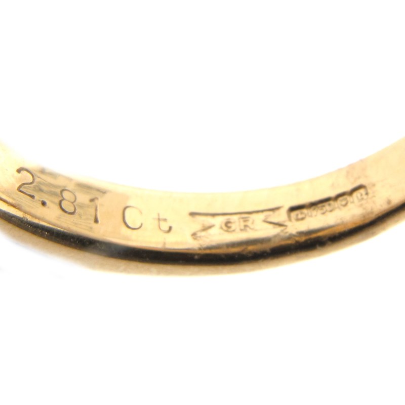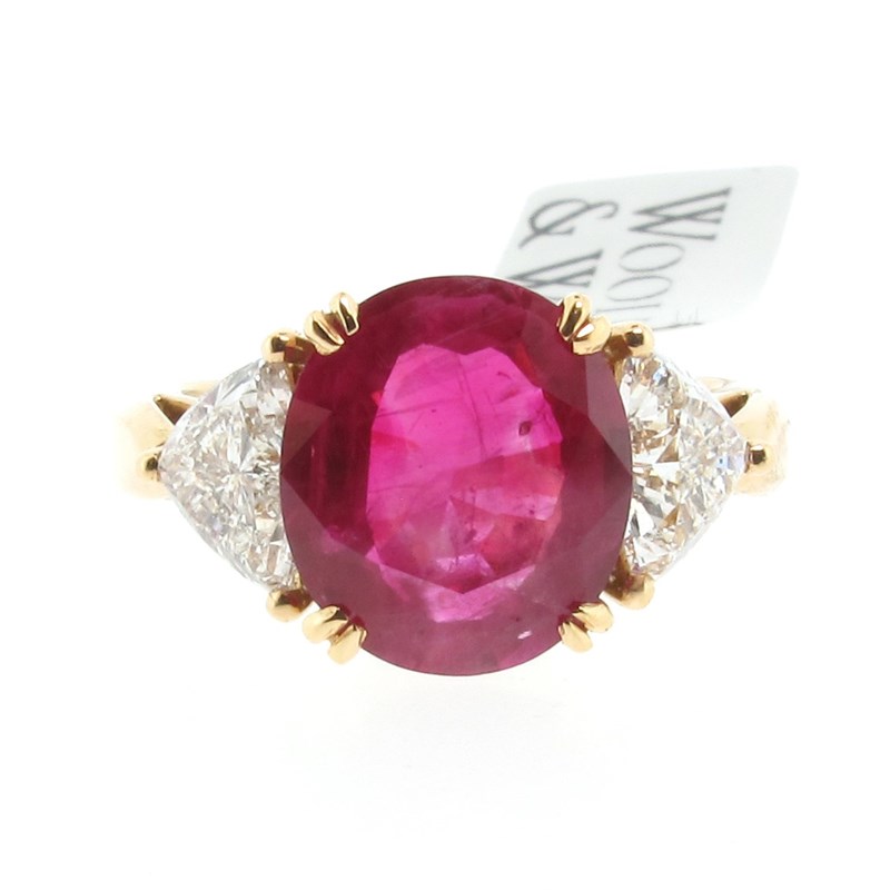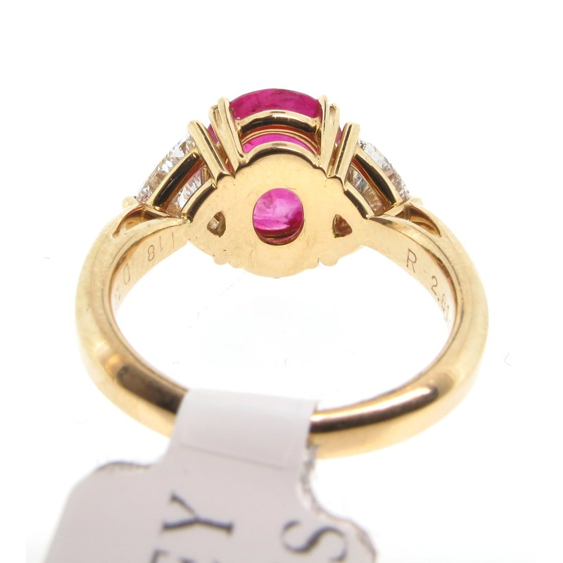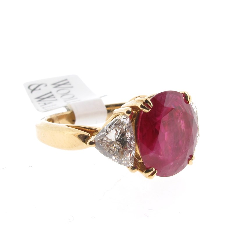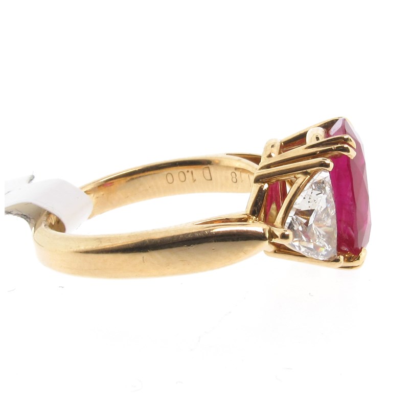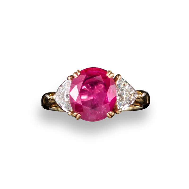 A ruby and diamond three-stone ring, the oval-shaped ruby weighs approximately 2.80cts and is set with triangular-cut shoulder diamonds in 18ct yellow gold, size J