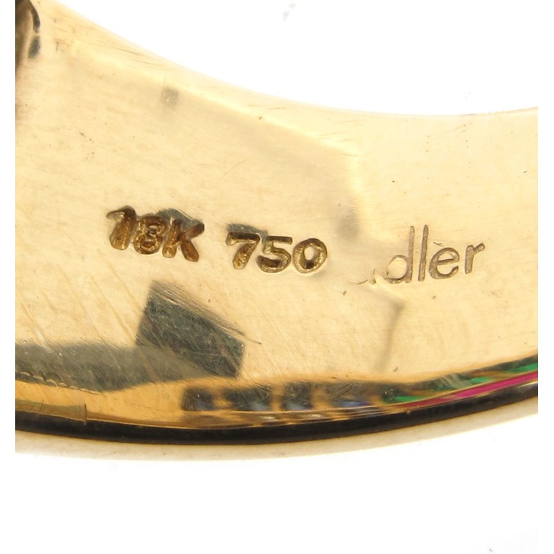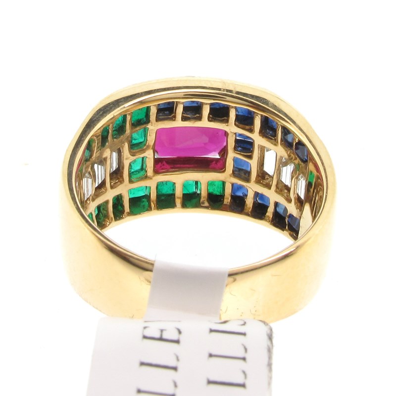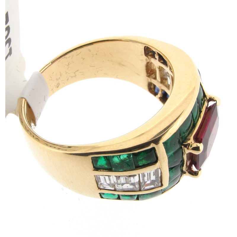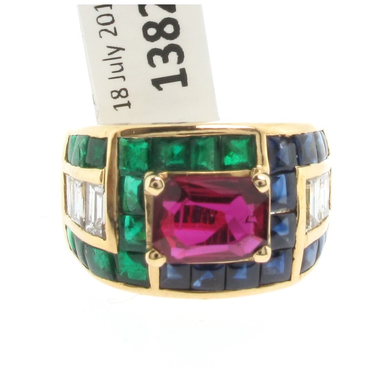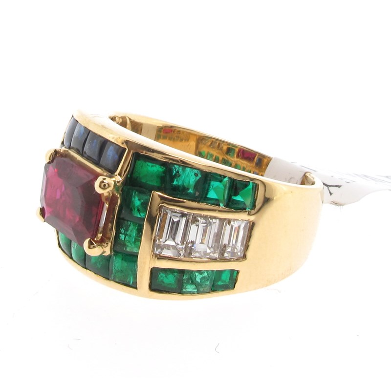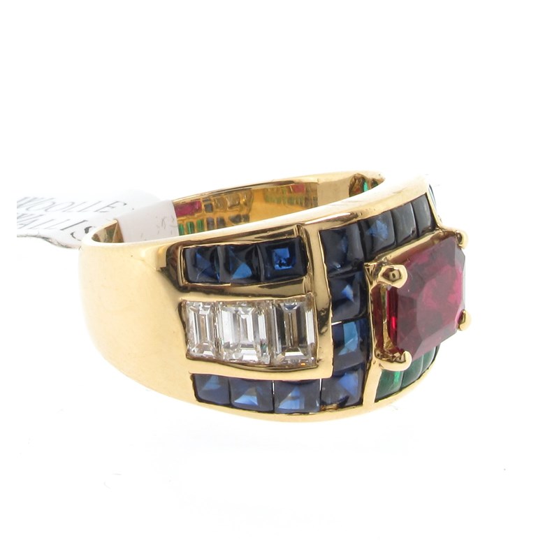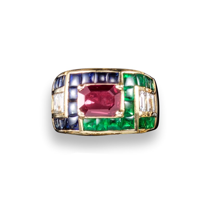 A ruby, emerald, sapphire and diamond ring by Adler, set with an emerald-cut ruby weighing 1.51ctS within a geometric surround of bufftop emeralds and sapphires and graduated baguette-shaped shoulder diamonds in yellow gold, size Q