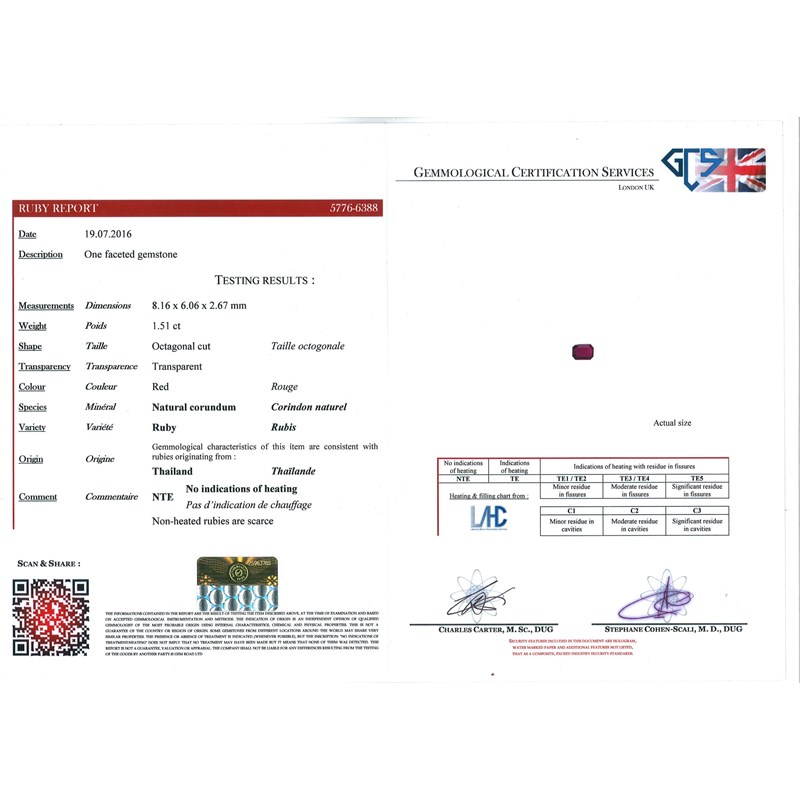 Accompanied by report number 5776-6388 dated 19 July 2016 from GCS, London stating that the octagonal-cut ruby weighs 1.51cts and is natural ruby with no indication of heat treatment. Origin: Thailand