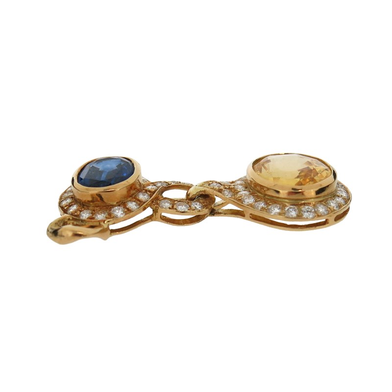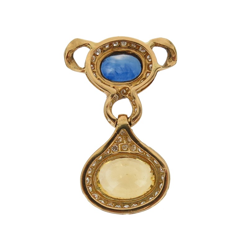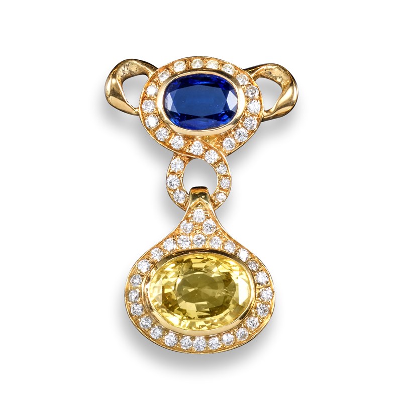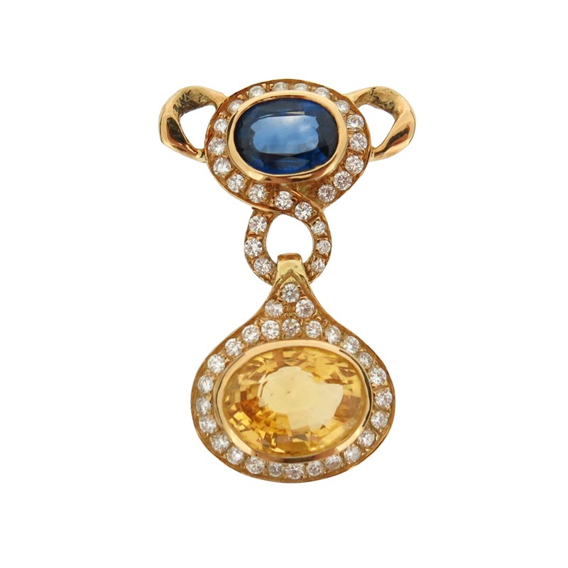 A sapphire and diamond pendant, set with an oval-shaped blue sapphire and a larger yellow sapphire weighing approximately 10.50cts, rubover-set within a surround of round brilliant-cut diamonds in yellow gold, 4.8cm high