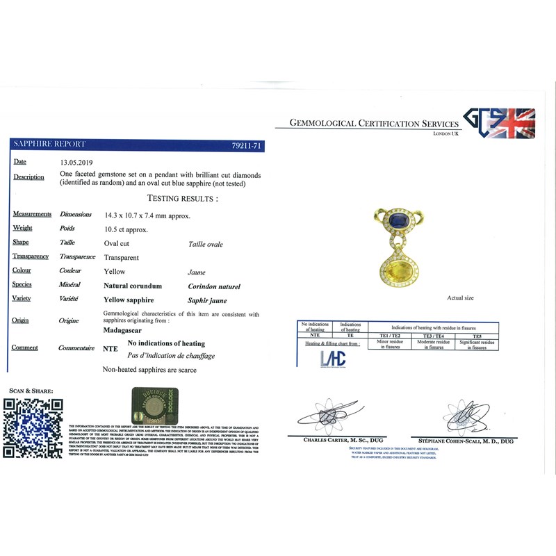 Accompanied by report number 79211-71 dated 13 May 2019 from GCS, London stating that the oval-shaped sapphire is a natural yellow sapphire with no indications of heat treatment. Origin: Madagascar.
