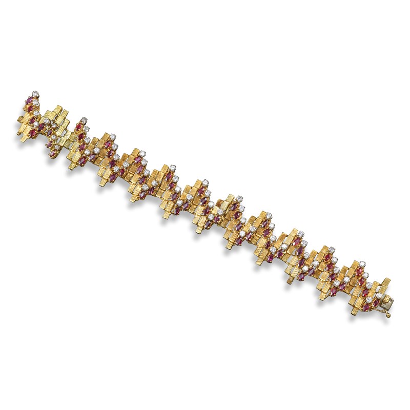A gold, ruby and diamond bracelet, 1970s, formed with striated gold rectangular sections and mounted with lines of circular-cut diamonds and marquise-shaped rubies, 19cm, 69g