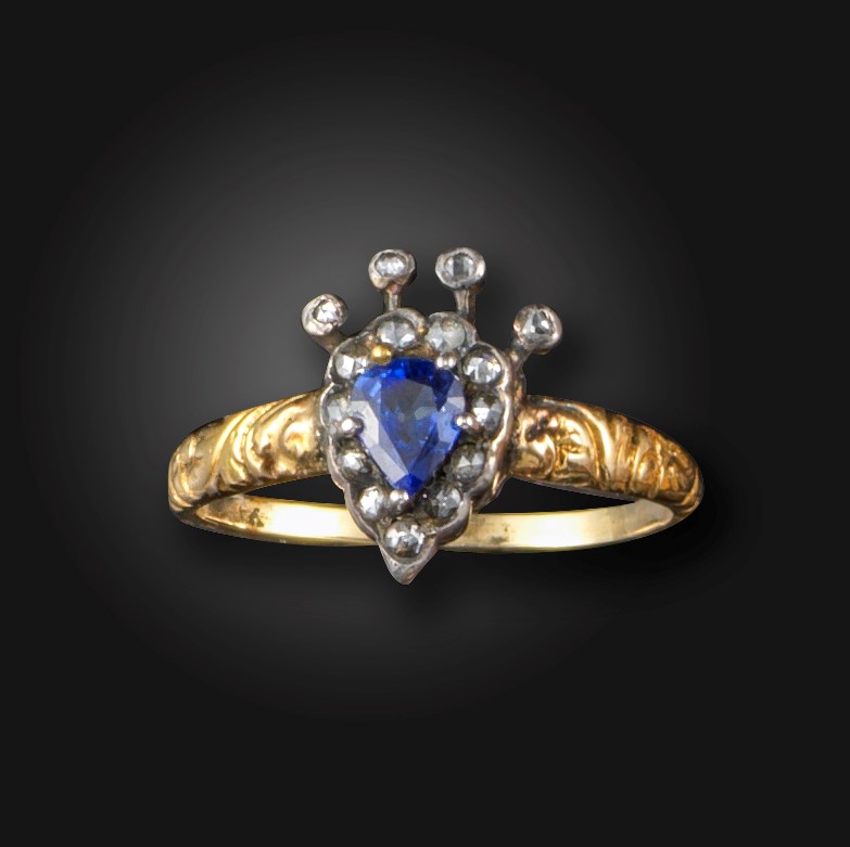 A sapphire and diamond cluster ring, centred with a pear-shaped sapphire within a surround of rose-cut diamonds, with foliate engraved decoration to the gold shoulders, size L