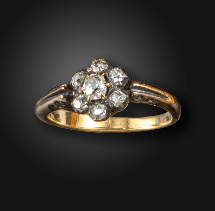 A Victorian diamond cluster ring, set with graduated old cushion-shaped diamonds in silver and yellow gold, size L