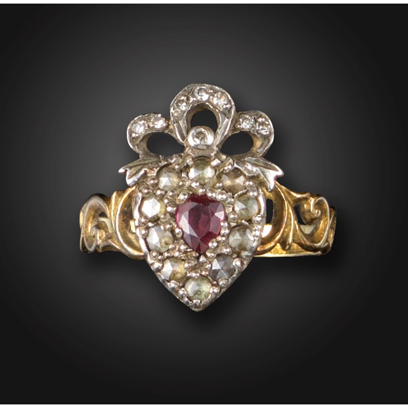A George III ruby and diamond cluster ring, the heart-shaped cluster centred with a pear-shaped ruby within a surround of rose-cut diamonds, surmounted with a diamond-set bow in closed-back silver and gold mount, with pierced and carved scrolling gold shoulders, size M