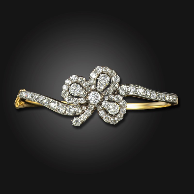 A late Victorian diamond-set convertible bangle, the shamrock centre section set with old circular-cut diamonds, with further graduated old circular-cut diamonds to the bangle shoulders in silver on gold, the shamrock detaches to be worn as a pendant, folding pendant loop, pendant 3cm high, bangle 5.8cm internal diameter