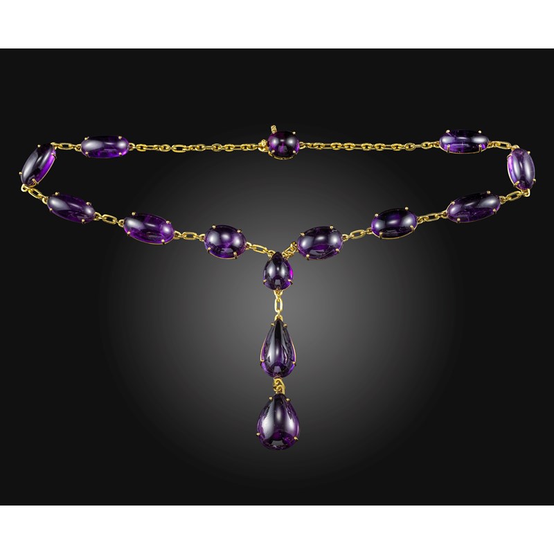An amethyst-set gold necklace, set with oval and pear-shaped amethyst cabochons in gold mounts, 40cm long, drop section 8cm high