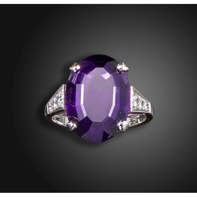 An amethyst and diamond ring, centred with an oval-shaped amethyst with graduated round brilliant-cut diamonds to each shoulder in white gold, size L 1/2