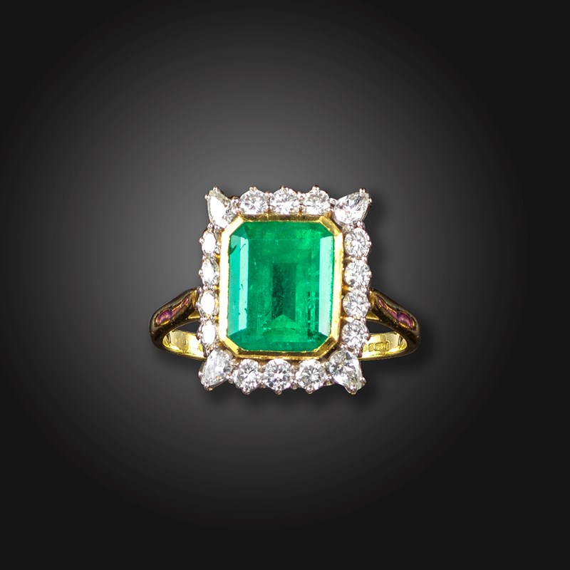 An emerald and diamond cluster ring, the emerald-cut emerald weighs approximately 4.50cts, set within a surround of round brilliant-cut and pear-shaped diamonds in gold, Sheffield marks for 1997, size V 1/2