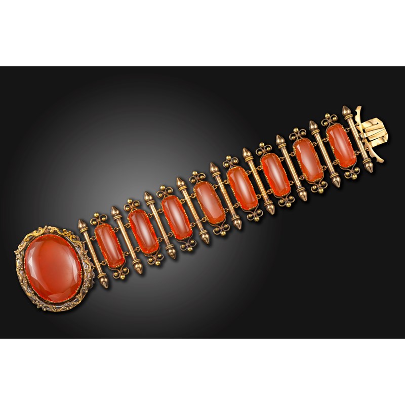 A Victorian carnelian-set gold bracelet, the rectangular-shaped carnelians with trefoil terminals, alternately-set with gold bar links, the clasp with a larger oval-shaped carnelian, 18cm long