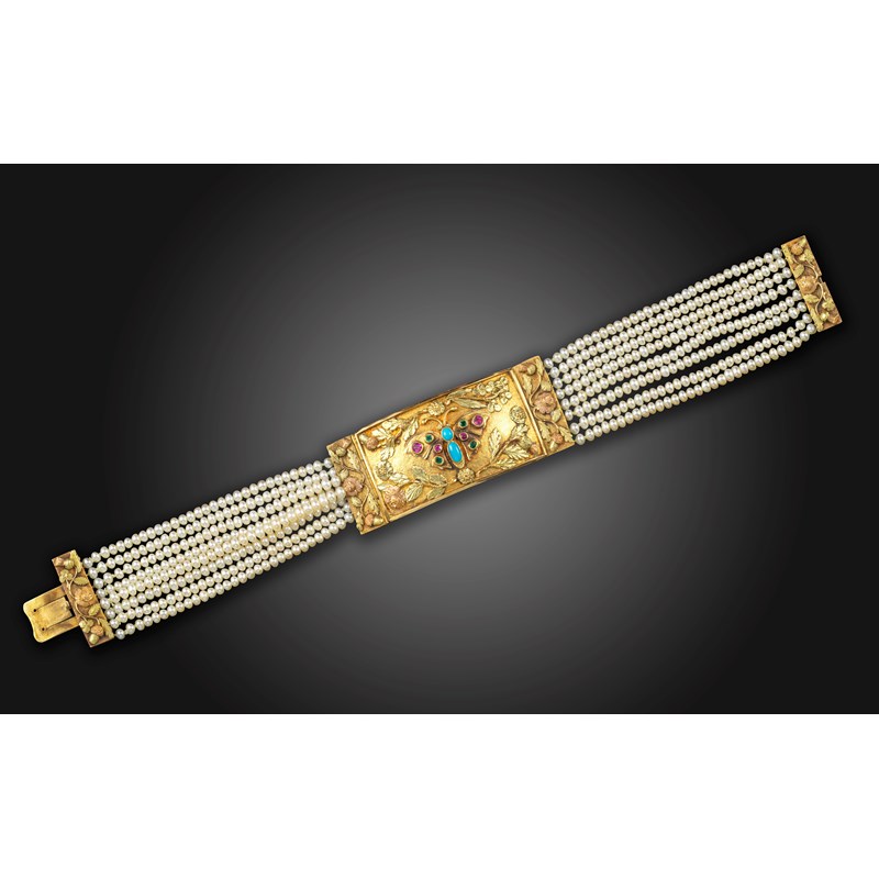 A Regency gold butterfly bracelet, the rectangular tri-colour gold bangle is decorated with a butterfly set with turquoise, rubies and emeralds within laurel surrounds on an eight row untested seed pearl bracelet with foliate gold clasp, 2.4cm wide, 20cm long, fitted case