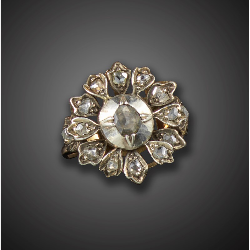 A diamond foliate cluster ring, set with graduated rose-cut diamonds in silver and gold, size O