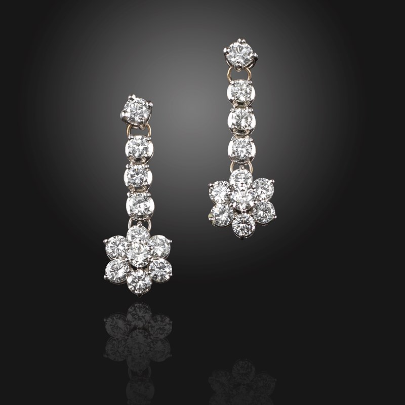 A pair of diamond drop earrings, the flowerhead section suspending from an articulated drop, set with round brilliant-cut diamonds in white gold, approximately 2.00cts total, post fittings, 3.2cm high