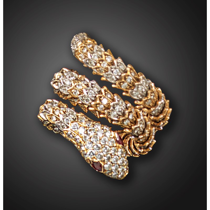 A gem-set gold snake ring, pave-set with round brilliant-cut diamonds to the head, tail and articulated body, with marquise-shaped ruby eyes in two-colour gold, approximately size N