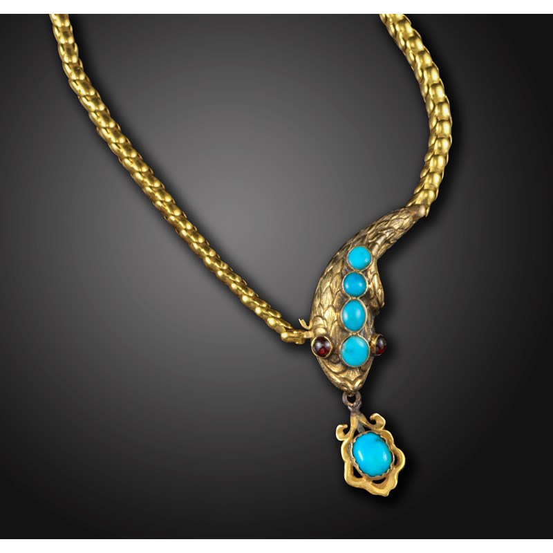 A Victorian gem-set gold snake necklace, the head set with graduated turquoise cabochons and garnet eyes, suspending a turquoise-set gold drop, on a graduated snake-link necklace, 43cm long