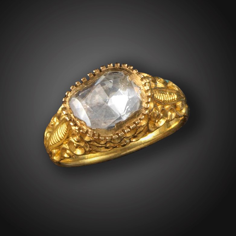 A rose-cut diamond solitaire ring, bezel-set with engraved and pierced scroll decoration to the gallery in gold, size L1/2