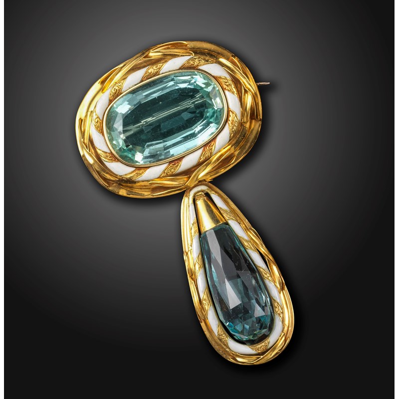 A Victorian aquamarine and enamel brooch, the oval shaped aquamarine is set within twisted white enamel and yellow gold border, the brooch suspending a detachable pendant set with an aquamarine briolette within conforming yellow gold and enamel border, 7cm high, fitted case