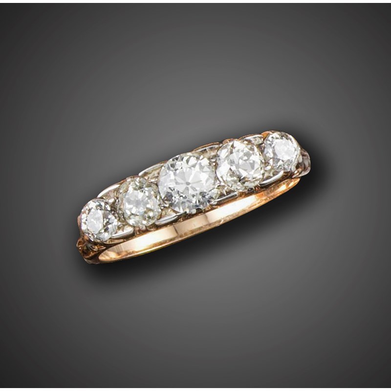 A late 19th century diamond half-hoop ring, set with five graduated old circular-cut diamonds in a pierced and carved scrolling gold mount, size L 1/2