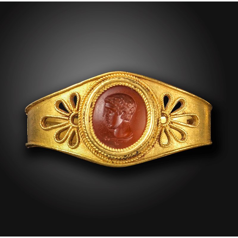 A late 19th century Archaological Revival gold scarf ring by Wièse, set with a Roman carnelian intaglio depicting Hercules with the lion skin to his shoulders, c.1st century AD, the gold scarf ring with openwork motif to the shoulders and with ropetwist decoration, French control mark, signed, maker's mark, 3cm wide, intaglio 1cm high