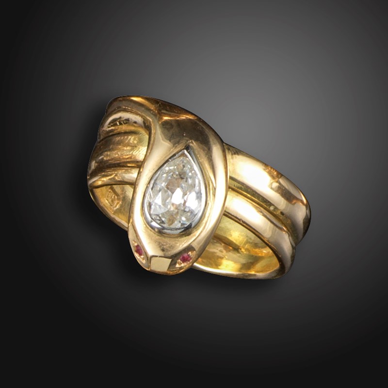 A diamond-set gold snake ring, set with an old pear-shaped diamond weighing approximately 0.35cts, with ruby eyes in gold, size L