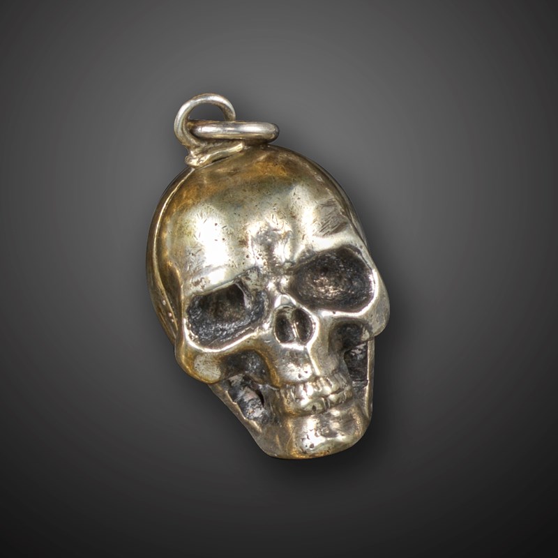 A 19th century memento mori silver skull pomander, realistically formed with hinged compartment containing a bone dice, inscription the reverse 'In memoriam GGE 1896' (possibly later), 2.2cm high
