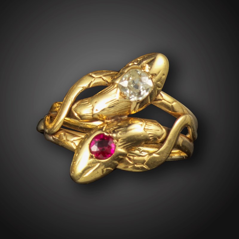 A gem-set gold double snake ring, set with an old cushion-shaped diamond and a circular-cut synthetic ruby with engraved decoration to the entwined snakes in gold, approximately size W