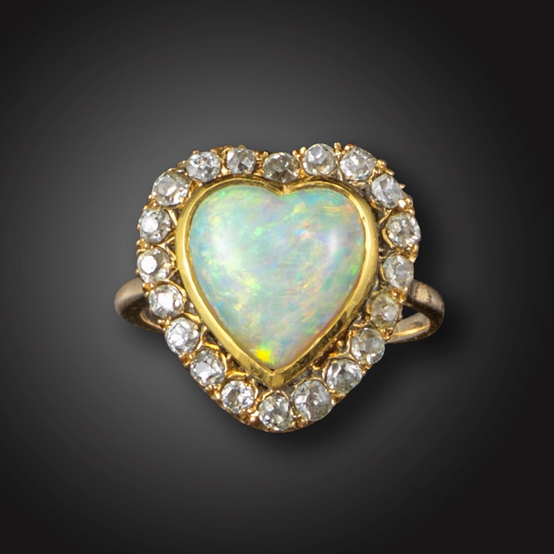 A heart-shaped opal and diamond cluster ring, the solid white opal heart-shaped cabochon is set within a surround of old cushion-shaped diamonds in gold, N ½