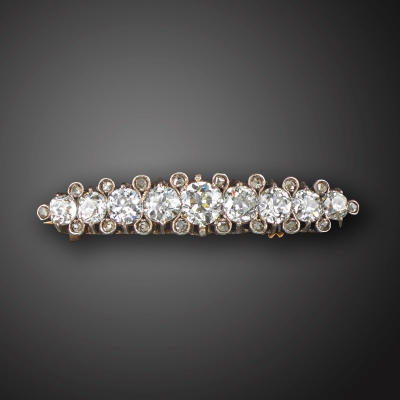 A 19th century diamond hairslide / brooch, set with graduated old cushion-shaped diamonds and rose-cut diamond pointers in silver and gold, detachable brooch fitting to reverse, 4cm wide