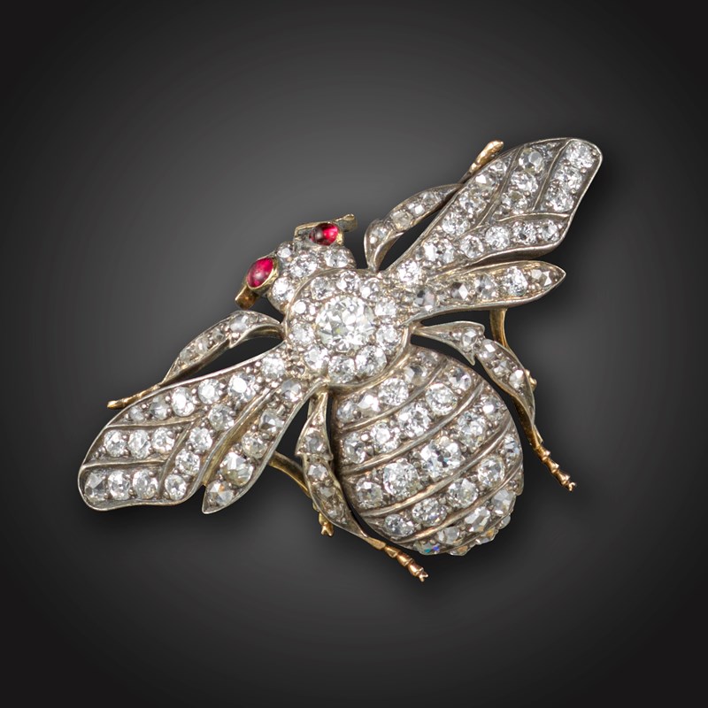 A Victorian diamond-set bee brooch, centred with an old circular-cut diamond weighing approximately 0.40cts, pave-set overall with further old circular-cut diamonds, cabochon ruby eyes in silver on gold, 5cm wide