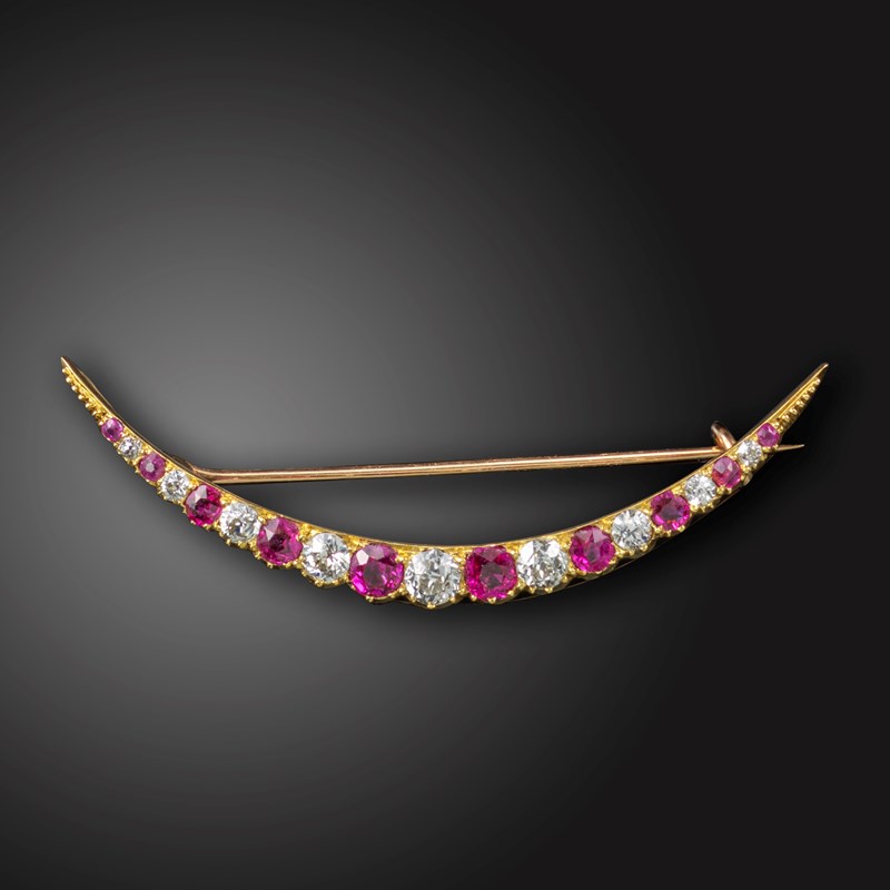 A Victorian gem-set crescent brooch, the open crescent set with gradauted old circular-cut diamonds and rubies in gold, 6.5cm wide, fitted case