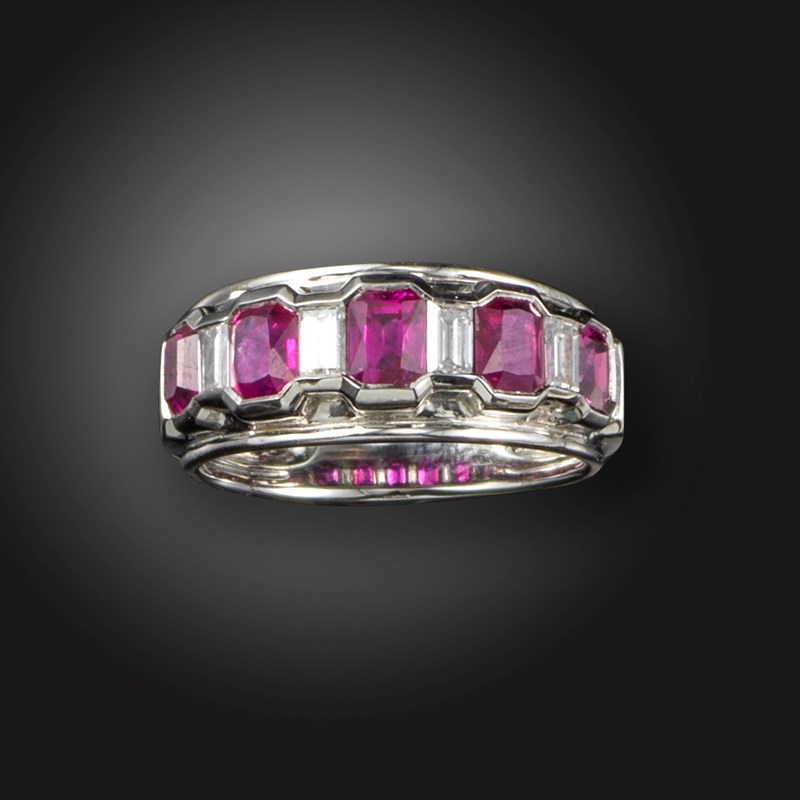 A ruby and diamond half-hoop ring, alternately channel-set with rectangular-shaped rubies and baguette-shaped diamonds in platinum, size O