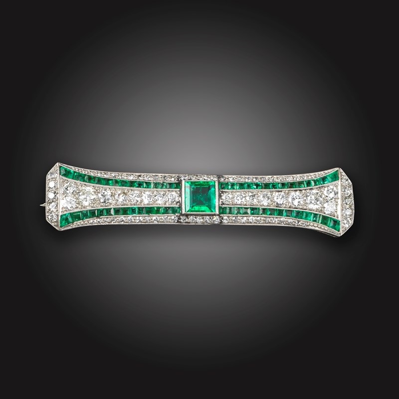 An Art Deco emerald and diamond brooch, centred with a square-shaped emerald, within a surround of calibre-cut emeralds and set with graduated old circular-cut diamonds in platinum, 5.8cm wide, fitted case by Harvey & Gore