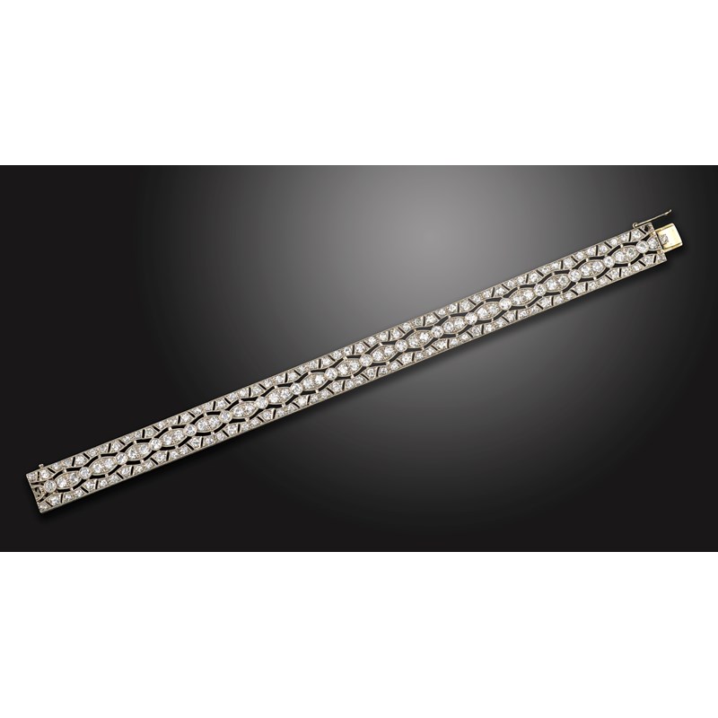 A diamond bracelet, the pierced geometric design is millegrain-set with graduated old circular-cut diamonds (one missing) in platinum and white gold, 18.3cm long