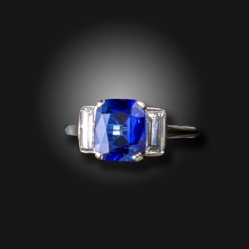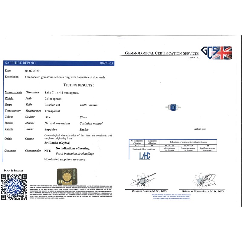 Accompanied by report number 80274-55 dated 4 September 2020 from GCS stating that the cushion-cut sapphire weighs approximately 2.50cts, and is a natural sapphire with no indications of heat treatment. Origin: Sri Lanka (Ceylon)