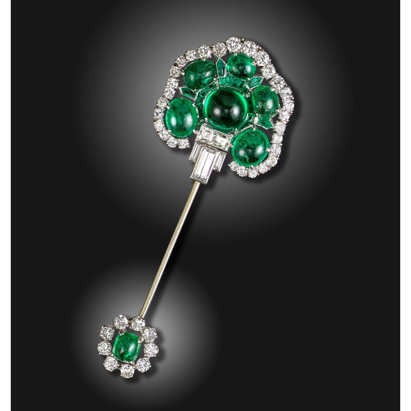 An emerald and diamond-set jabot pin, of stylised palmette form, set with six cabochon emeralds within a surround of calibre-cut emeralds and baguette-shaped diamonds, with an undulating outer border of round brilliant-cut diamonds, the smaller terminal set with an emerald and diamond cluster, in platinum and white gold, 7.5cm long