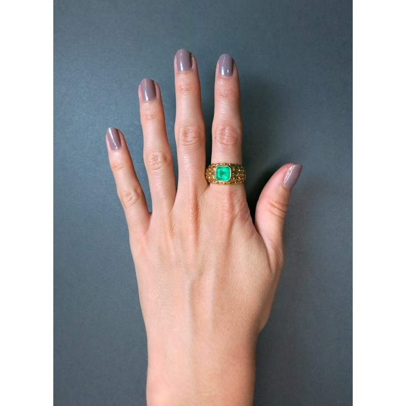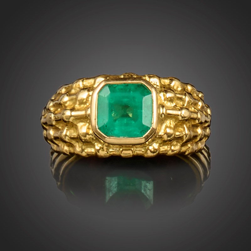 An emerald-set gold dress ring, the emerald-cut emerald is rubover-set to a textured gold tapered band with fluted shank, rubbed maker's lozenge, size T