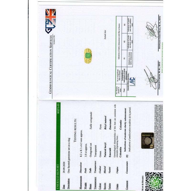 Accompanied by report number 80275-93 dated 29 September 2020 from GCS stating that the octagonal-cut emerald is a natural emerald with indications of moderate clarity enhancement. Origin: Colombia.