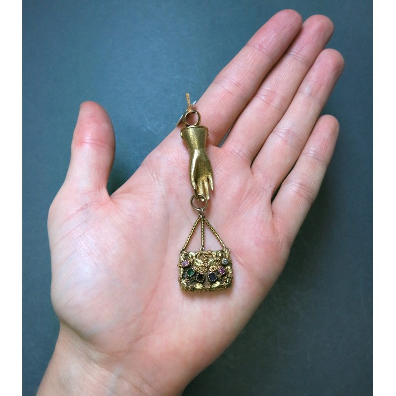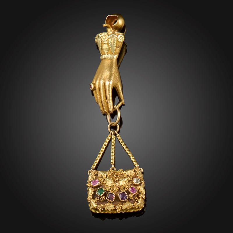 A Regency gem-set gold acrostic bag-form locket pendant, set with a ruby, emerald, garnet, amethyst, ruby and diamond spelling 'REGARD' with heavy foliate scroll decoration on matted ground and clusters of flat pellets to the reverse, opening to reveal a glazed locket compartment, suspended on three fine link gold chains from a George III hand-form clasp with red stone ring and foliate decorated cuff, locket 2cm wide