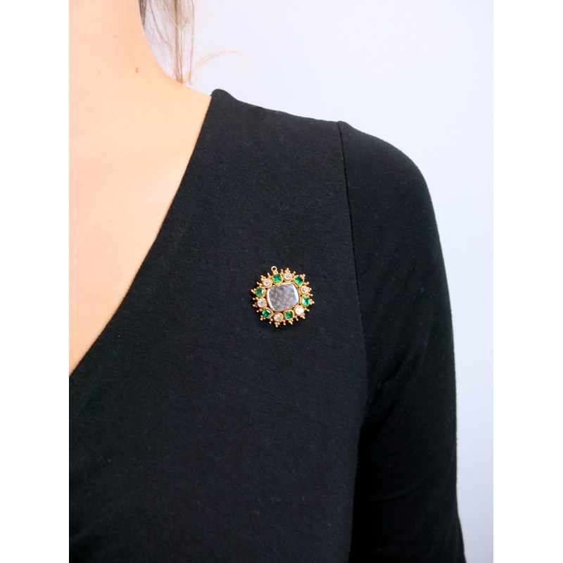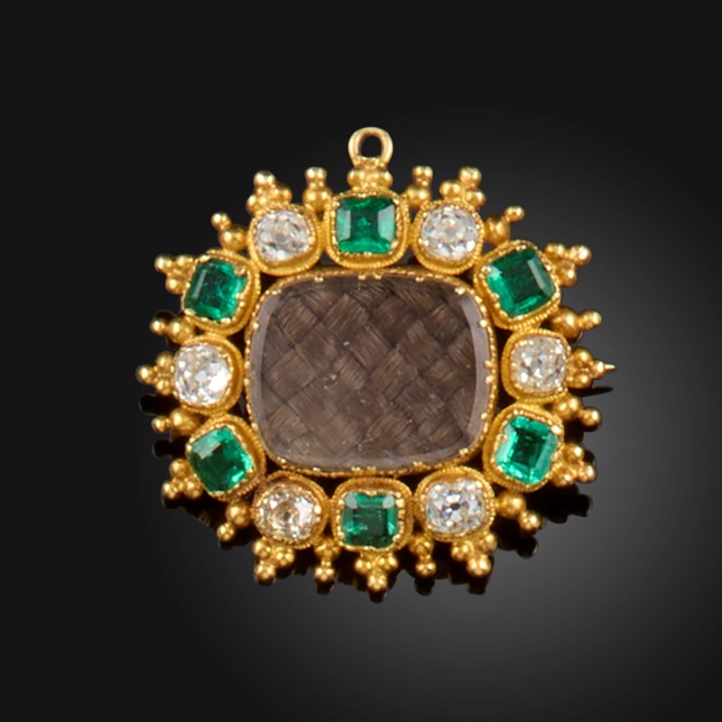 A Regency gold pendant brooch, centred with a glazed compartment containing plaited hair within a surround of alternately-set emeralds and diamonds with pellet border, a further glazed and hinged locket compartment to the reverse, 2.5cm wide