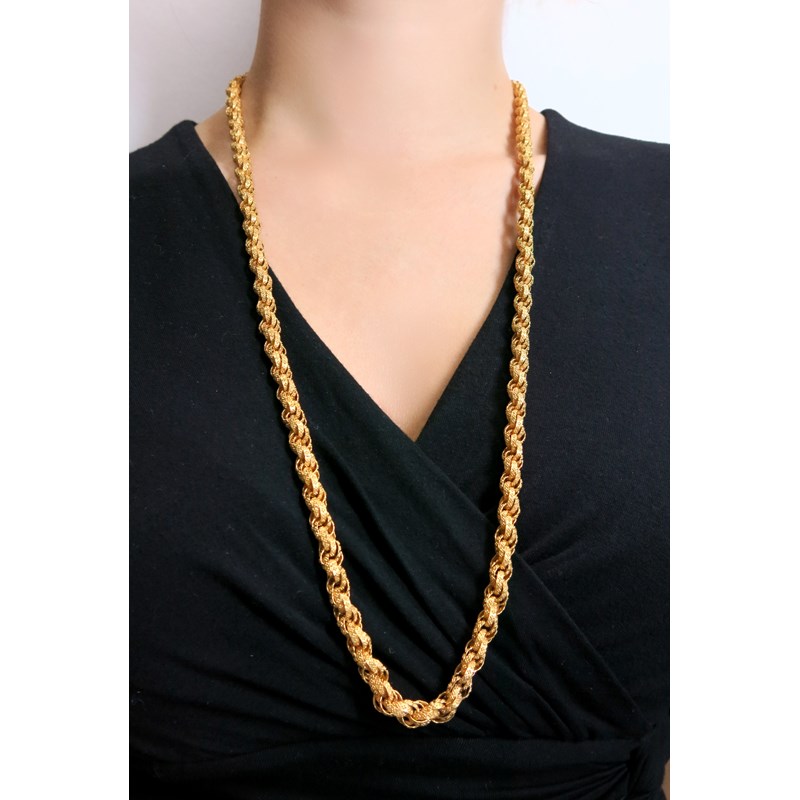 A 19th century gilt metal fancy-link guard chain, triple oval-links are decorated with pellet quatrefoils, conforming barrel clasp, 78cm