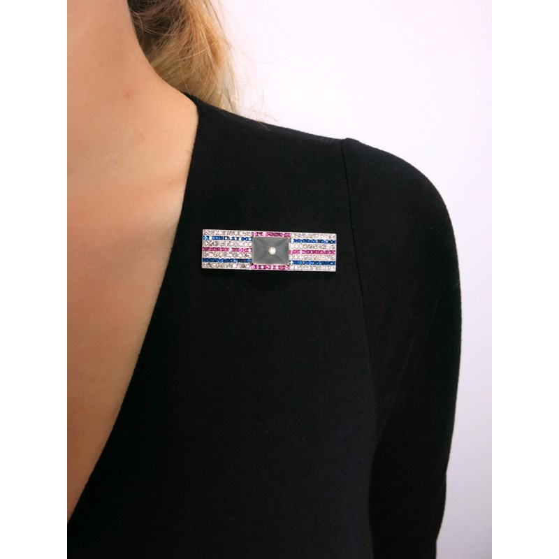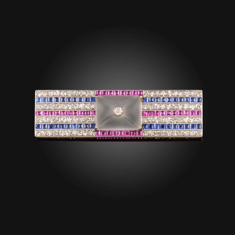 An Art Deco rectangular platinum brooch, millegrain set with lines of old circular-cut diamonds, calibre-cut sapphires and calibre-cut rubies, centred with a rectangular section of frosted rock crystal applied with a circular-cut diamond, 5.5cm wide