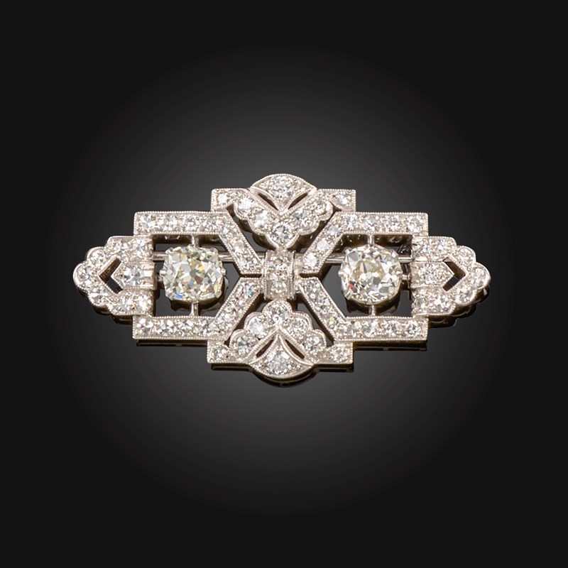 An Art Deco diamond-set brooch, the stylized bow centre section, millegrain-set overall with graduated circular-cut diamonds, with two larger old circular-cut diamonds within similar diamond-set mounts in platinum, 4.7cm wide