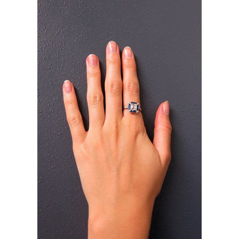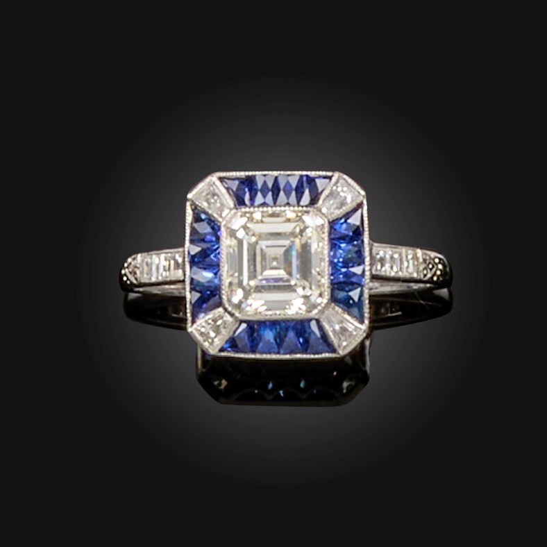 A diamond and sapphire cluster ring, the square emerald-cut diamond is set within a surround of calibré-cut sapphires and a tapered baguette-shaped diamond to each corner, six further square-shaped diamonds to the shoulders in platinum, size P