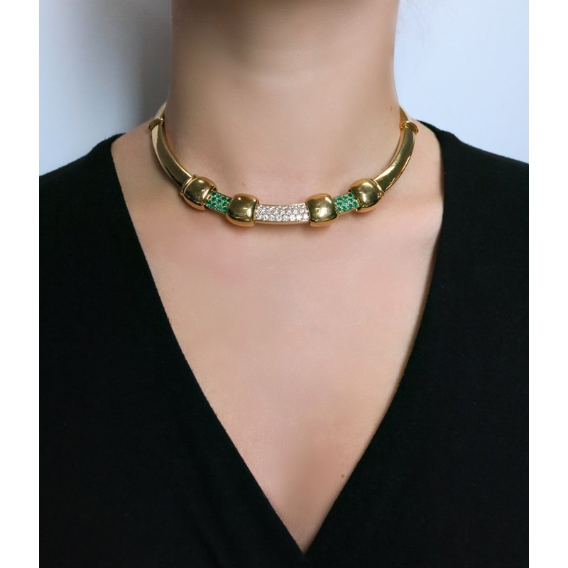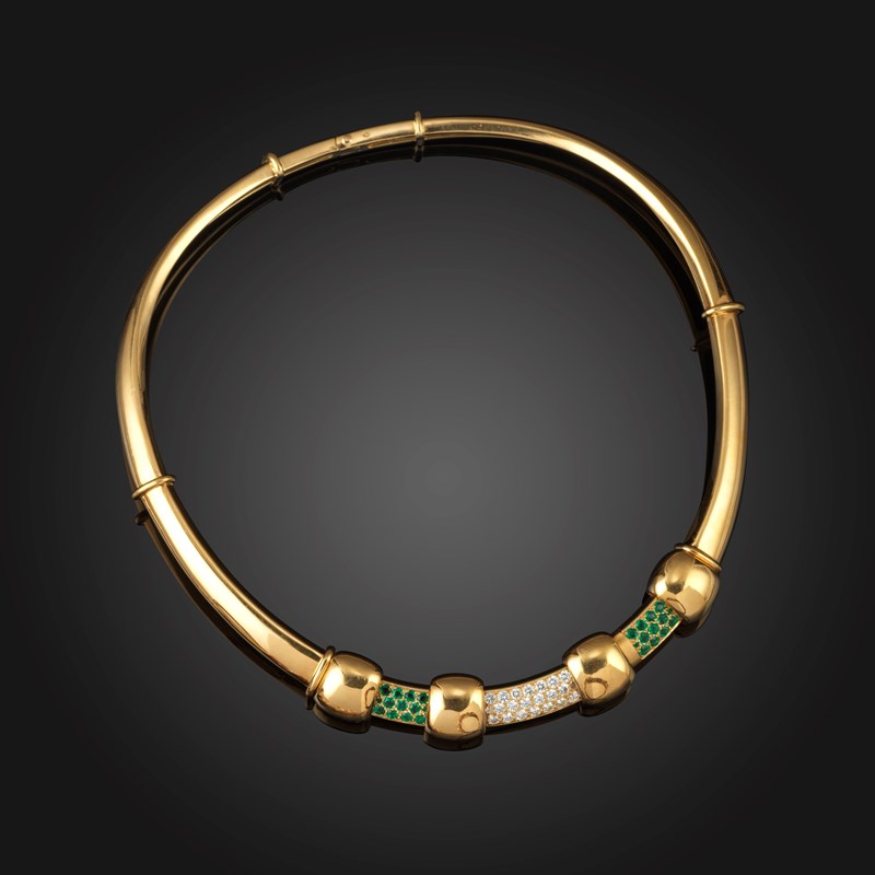 An emerald and diamond-set gold collar necklace by Boivin, c1970's, the front section pave-set with round brilliant-cut diamonds and circular-cut emeralds, with four sliding gold sections which move to reveal or conceal the gems or brushed gold sections, French control mark, maker's mark, 12cm diameter, 38cm circumference approximately