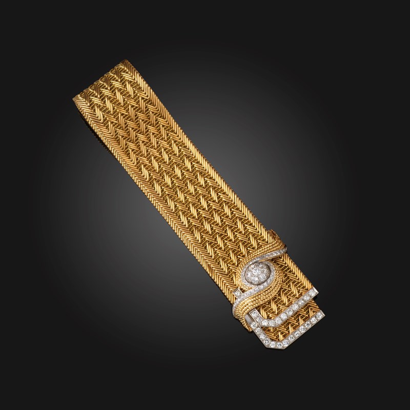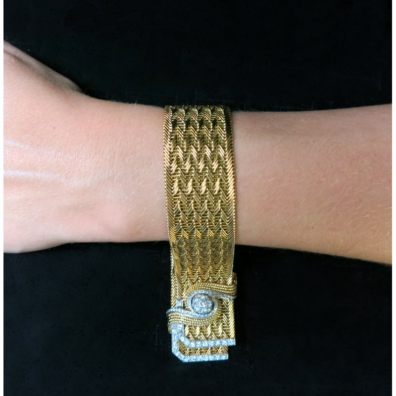 A French diamond-set wide gold strap bracelet, c.1950's, of braided fabric design in gold, the terminals set with round brilliant-cut diamonds in platinum on gold, with hinged S-shaped clasp of ropetwist design and set with lines of circular-cut diamonds and a centre diamond-set bombe-section, French control mark, obscured maker's mark, 18cm approximately (25cm long open)