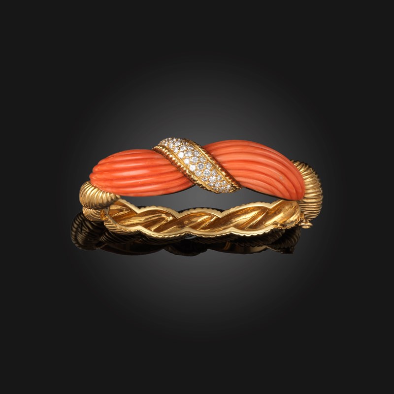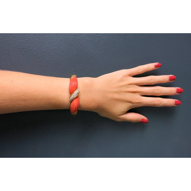 λ A French diamond and coral gold bangle, c.1970, the hinged scrolling fluted gold bangle with carved fluted coral sections, the centre pavé-set with round brilliant-cut diamonds, French control mark, maker's mark, 5.2cm diameter